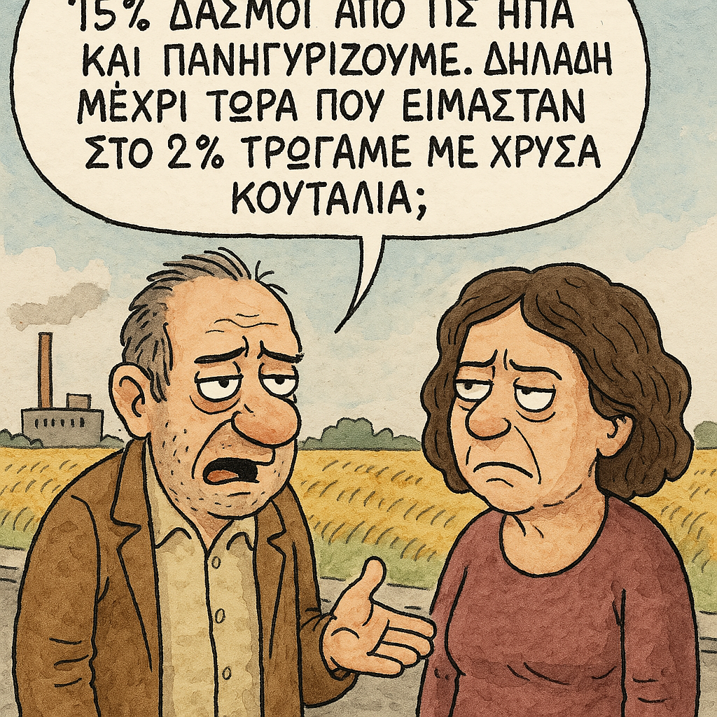 15% δασμοί από τις ΗΠΑ και πανηγυρίζουμε. Δηλαδή μέχρι τώρα που είμασταν στο 2% τρώγαμε με χρυσά κουτάλια;