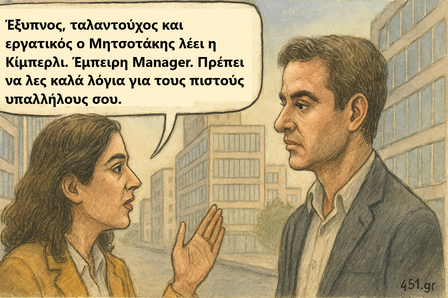 Έξυπνος, ταλαντούχος και εργατικός ο Μητσοτάκης λέει η Κίμπερλι. Έμπειρη Manager. Πρέπει να λες καλά λόγια για τους πιστούς υπαλλήλους σου.