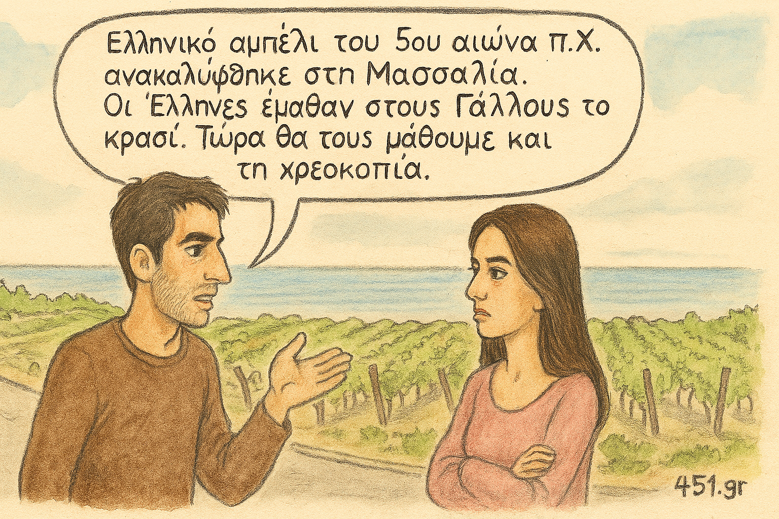 Ελληνικό αμπέλι του 5ου αιώνα π.Χ. ανακαλύφθηκε στη Μασσαλία. Οι Έλληνες έμαθαν στους Γάλλους το κρασί. Τώρα θα τους μάθουμε και τη χρεοκοπία.