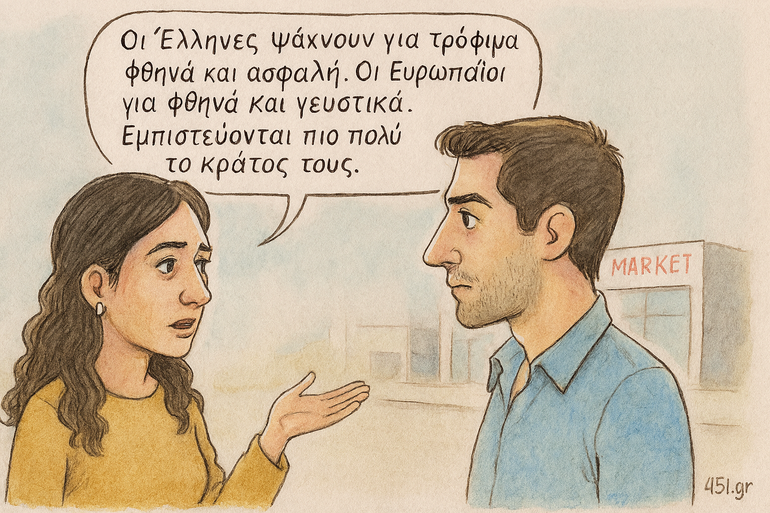 Οι Έλληνες ψάχνουν για τρόφιμα φθηνά και ασφαλή. Οι Ευρωπαίοι για φθηνά και γευστικά. Εμπιστεύονται πιο πολύ το κράτος τους. (Πηγή: Ειδικό Ευρωβαρόμετρο 2025)